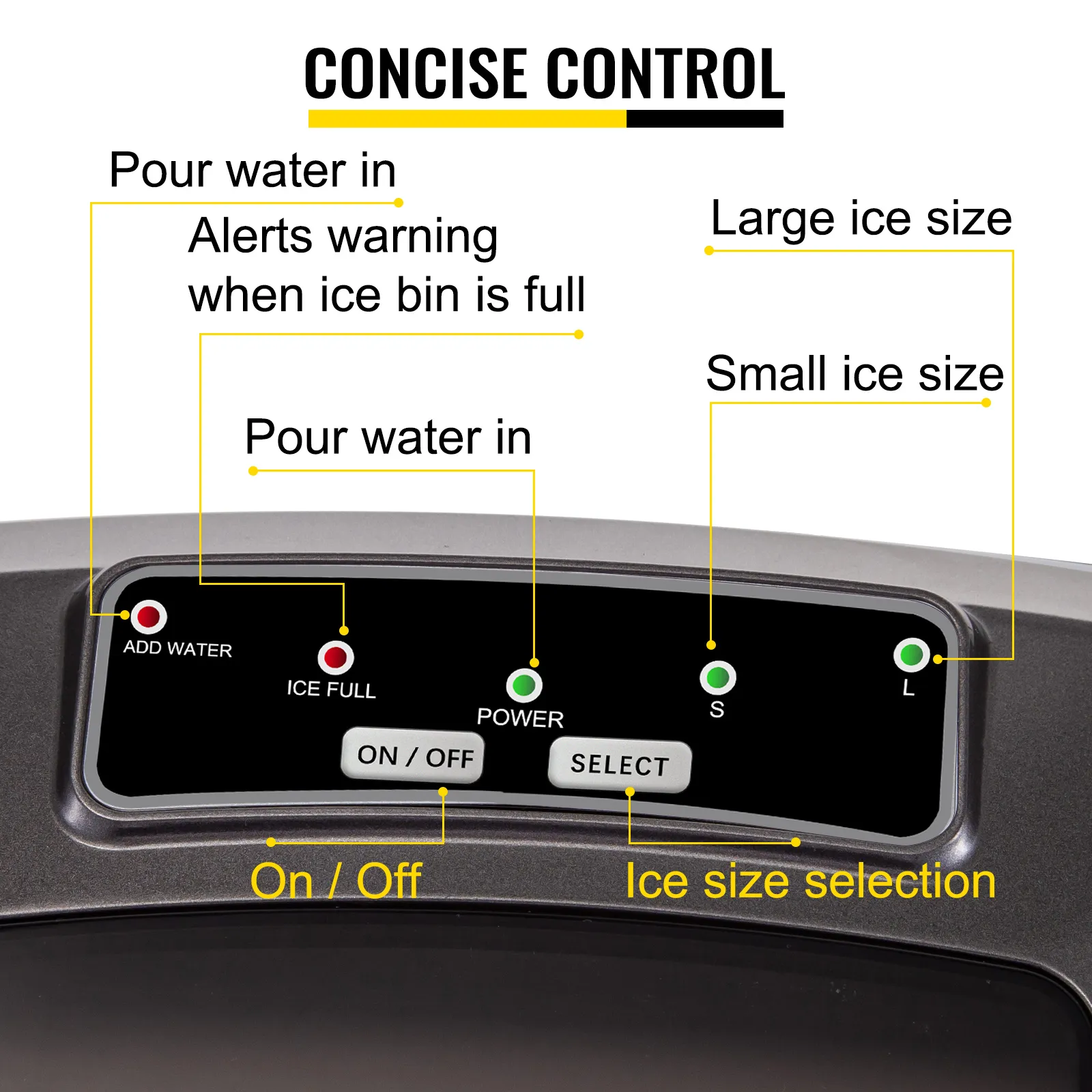 Einfache Steuertaste EIN / AUS und WÄHLEN mit LCD-Anzeigeleuchten, die den Betriebsstatus auf einen Blick erkennen lassen. Bei niedrigem Wasservorrat und vollem Eisbehälter werden Warnungen ausgegeben. Leistung und Eisgröße werden ebenfalls angezeigt.
