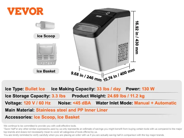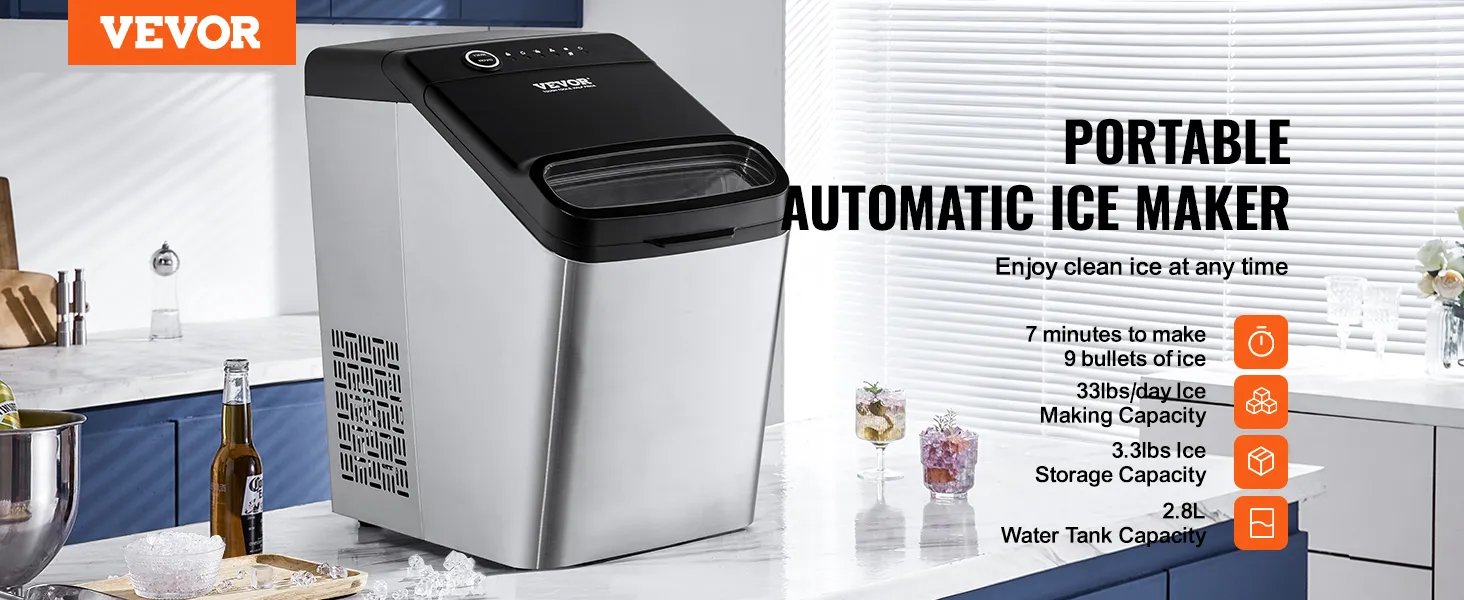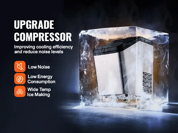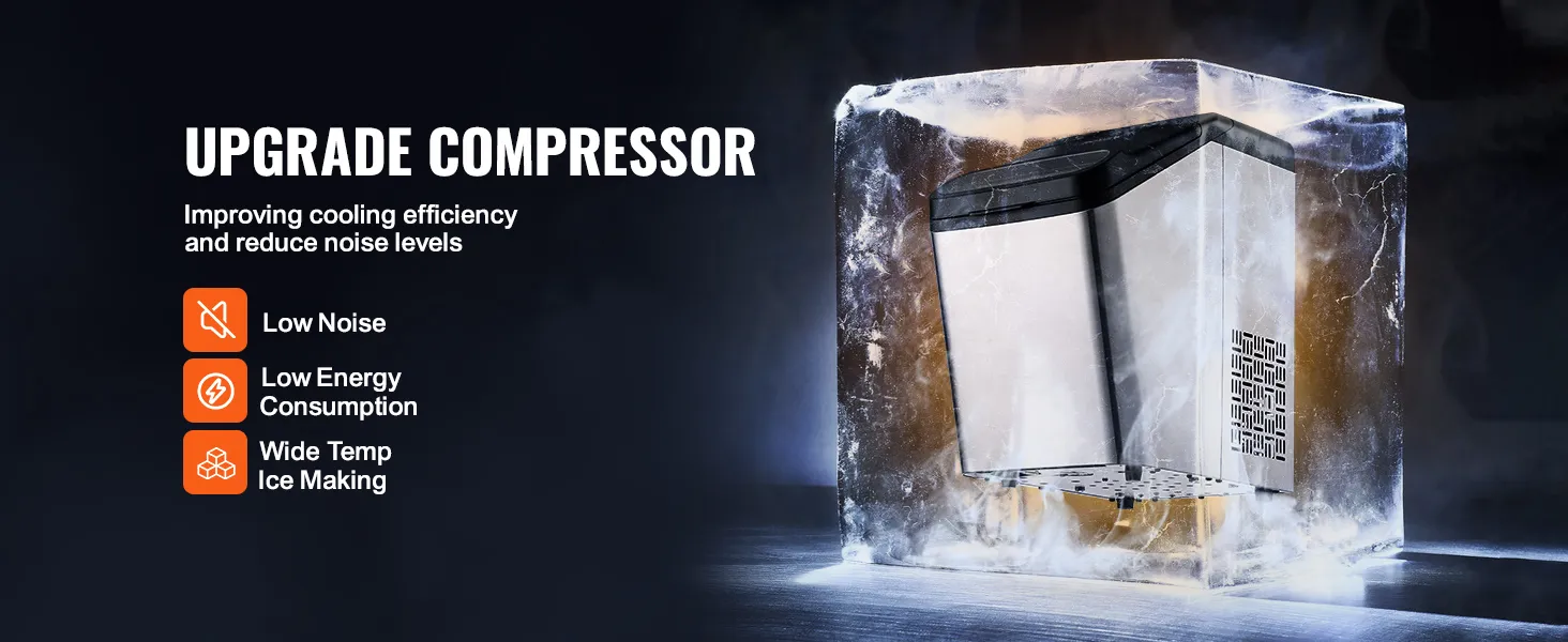 Effizienz ohne Lärm: Der Tisch-Eisbereiter ist mit einem Kompressor der Marke Huayi ausgestattet, der nur 130 W Leistung verbraucht, was ihn bei der Eisherstellung sehr effizient und leise macht. Der Geräuschpegel liegt unter 45 dBA.
