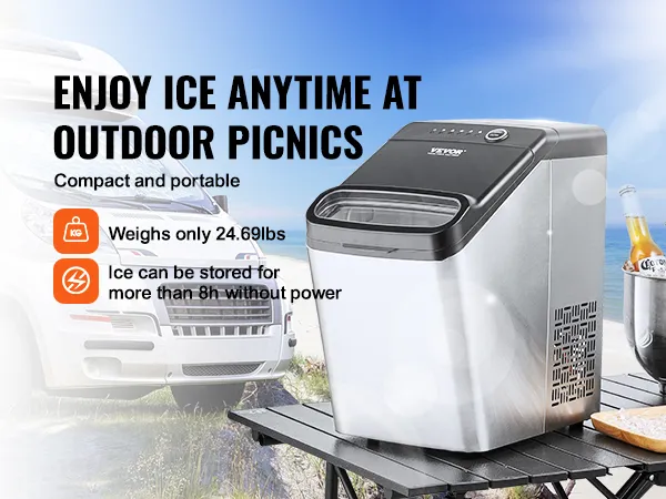 Dieser Eisbereiter produziert alle 24 Std. 15 kg Eis (bei 21,1 ℃ Testumgebung und 15 ℃ Wassereinlauftemperatur), wobei 9 Eisstücke in 7 Minuten fertig sind. Mit einem Inhalt von 1,5 kg kann er leicht zu Versammlungen und Picknicks mitgenommen werden. Genießen Sie immer frisches Eis!