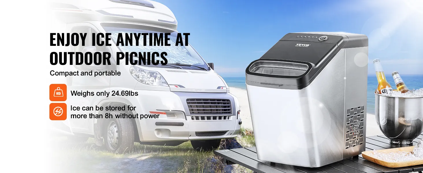 Die Kälte bleibt drinnen: Der tragbare Eiswürfelbereiter besteht aus einer 2,5 mm dicken Schaumstoffschicht, einem Edelstahlmantel und drei Schichten Isoliermaterial, sodass er bei einem Stromausfall über 8 Stunden lang Eis aufbewahren kann.