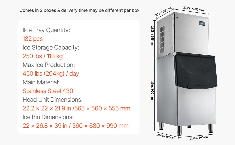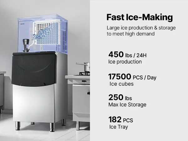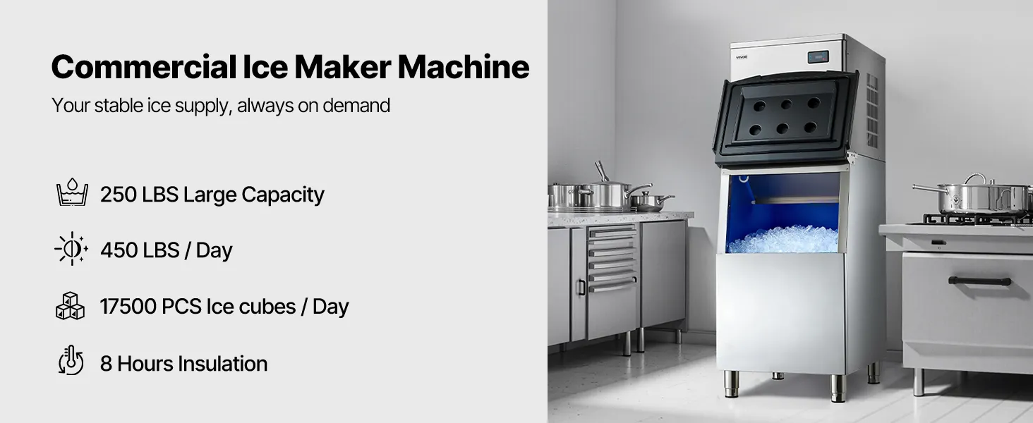 Große Eisproduktion: Dieser kommerzielle Eisbereiter kann 450 lbs (204 kg) Eis pro Tag produzieren, mit einer großen Kapazität von 250 lbs (113 kg) und hervorragender Isolierung, wodurch eine kontinuierliche Eisversorgung gewährleistet wird