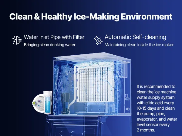 Leicht zu reinigen: Die kommerzielle Eismaschine verfügt über eine One-Touch-Selbstreinigungsfunktion, die Ihnen eine saubere und gesunde Eisherstellungsumgebung bietet und sicherstellt, dass die Eiswürfel sauber sind