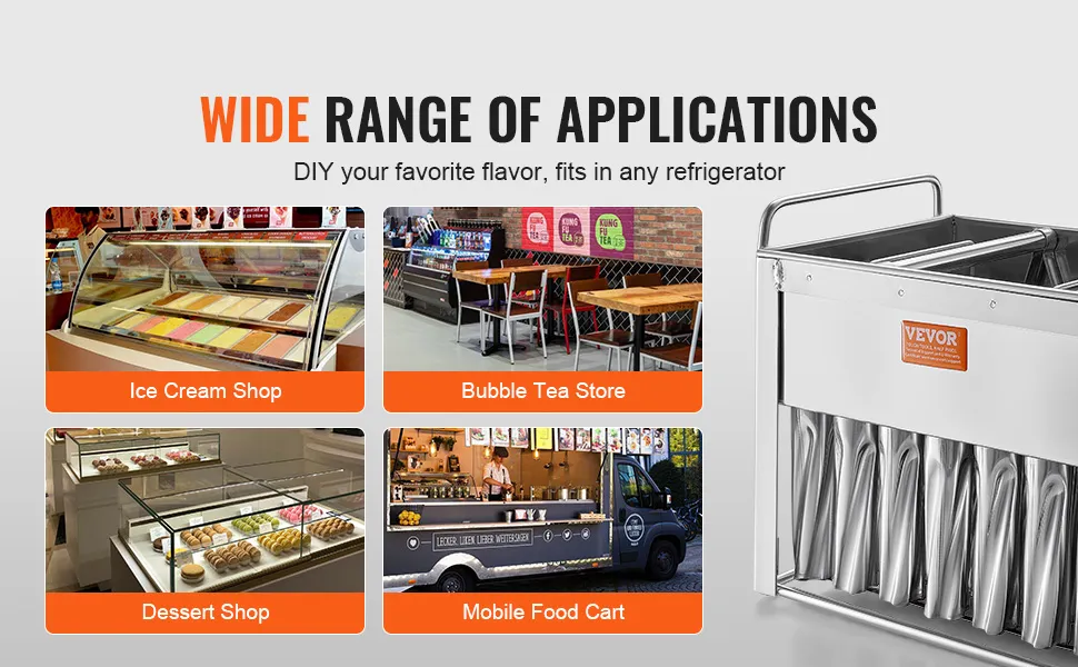 Die kommerziellen Eisformen von VEVOR sind ideal für verschiedene kommerzielle Umgebungen. Sie können in Cafés, Restaurants und Eisdielen verwendet werden. Die große Produktionskapazität erfüllt die Anforderungen anspruchsvoller Umgebungen. Die robuste Konstruktion gewährleistet Langlebigkeit auch bei häufigem Gebrauch. Sicherheitsfunktionen sind wichtig für die Aufrechterhaltung einer sicheren Küche. Das praktische Zubehör erleichtert die Herstellung und Lagerung. Der einfache Reinigungsprozess sorgt für die Einhaltung der Hygiene. All diese Funktionen machen die zylindrischen Eisformen zu einer hygienischen und praktischen Ergänzung für jede gewerbliche Küche!