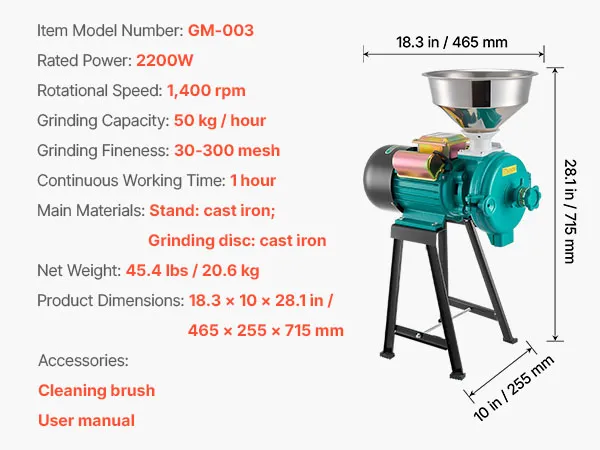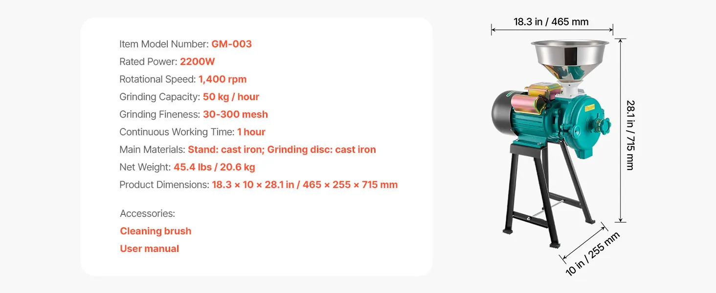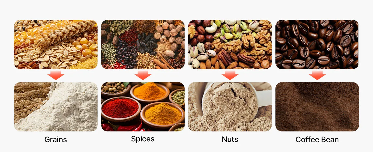 Mehrzweck-Trockengutsmühle: Diese elektrische Getreidemühle eignet sich zum Mahlen von Getreide wie Weizen, Sojabohnen, Mais und Kaffeebohnen sowie von Gewürzen wie Pfeffer, Zimt und Anis. Nicht geeignet für feuchte, ölige oder klebrige Materialien. Ideal für Landwirtschaftsbetriebe, Haushalte und Labore