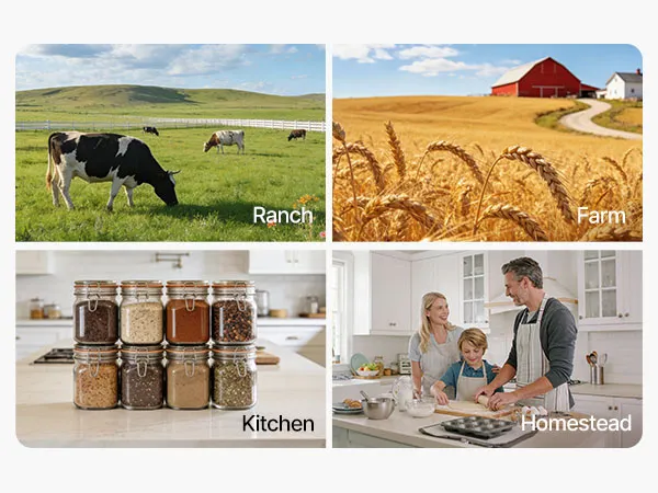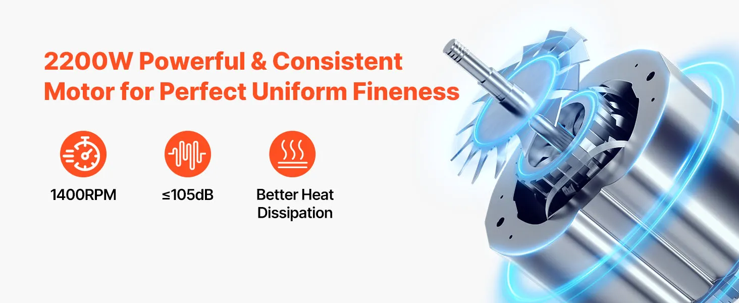 Leistungsstarkes Mahlen mit hoher Drehzahl: Mit einem 2200-W-Hochleistungsmotor, der mit 1400 U/min läuft, liefert diese Getreidemühle eine starke und stabile Leistung für das schnelle Mahlen von Weizen, Mais oder Kaffeebohnen. Sie verarbeitet ca. 50 kg pro Stunde und steigert so die Effizienz