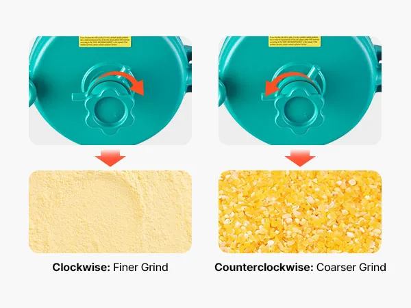 Einstellknopf für den Mahlgrad: Ausgestattet mit einem flexiblen Präzisionsknopf ermöglicht diese Mühle die einfache Einstellung des Mahlgrades von 30–300 Mesh für Getreide, Gewürze und Kräuter und bietet somit die Kontrolle von grob gemahlenem bis zu feinem Pulver für Koch- oder pharmazeutische Zwecke