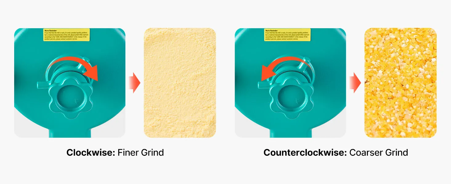 Schnelles Mahlen in vier Schritten: Die Bedienung ist kinderleicht: Gröbste Stufe einstellen, Begrenzer einsetzen, Schalter betätigen und die gewünschte Konsistenz feinjustieren. Diese Getreidemühle ermöglicht müheloses, effizientes Mahlen großer Mengen mit minimalem Aufwand