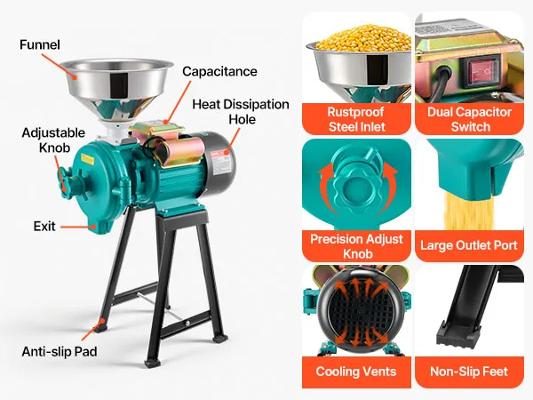 Diese Getreidemühle mit 2200 W Leistung bietet eine einstellbare Feinheitskontrolle, eine hohe Mahlgeschwindigkeit von 1400 U/min, eine robuste Konstruktion aus Gusseisen und Edelstahl, eine effiziente Kühlung sowie einen stabilen, rutschfesten Betrieb für eine lange Lebensdauer.