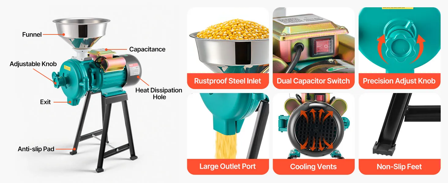 Robuste & rostfreie Konstruktion: Ausgestattet mit Mahlscheiben aus Gusseisen für eine stabile und langlebige Leistung sowie einem Einfüllstutzen aus Edelstahl für Rostbeständigkeit, verfügt diese Getreidemühle über Belüftungsöffnungen zur Kühlung und rutschfeste, stoßdämpfende Pads für einen sichereren und ruhigeren Betrieb