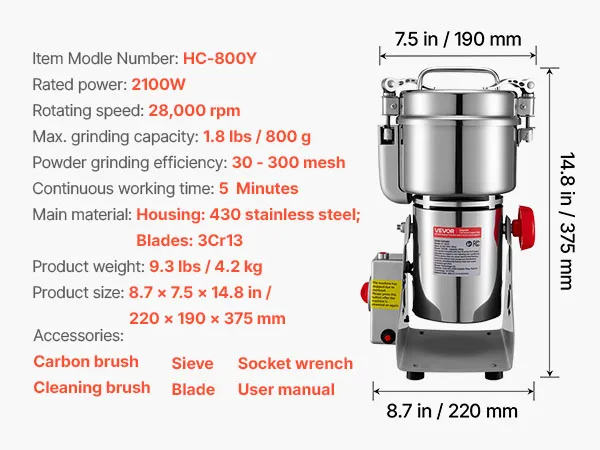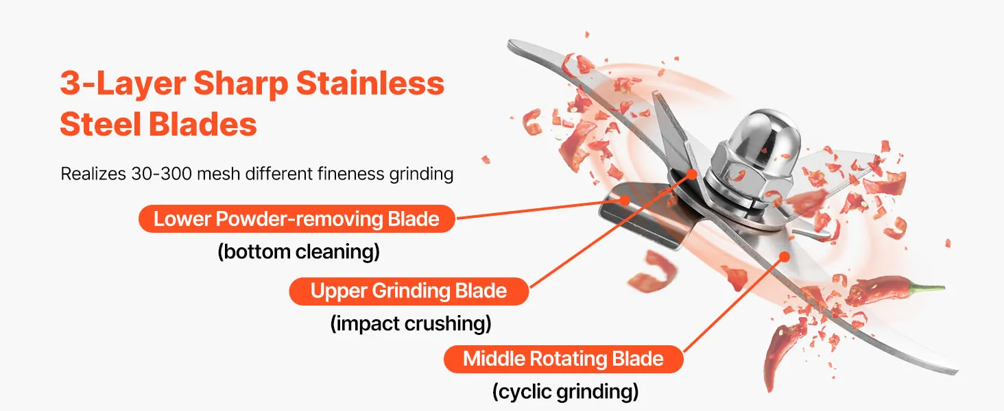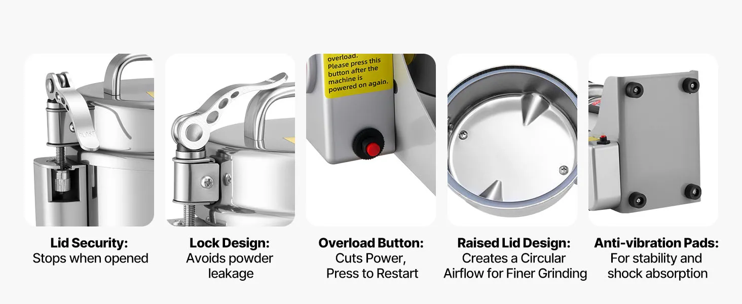 Diese Hochgeschwindigkeits-Getreidemühle (28.000 U/min) bietet eine Mahlgenauigkeit von 30–300 Mesh mit Timer-Einstellungen von 5–30 Sekunden, Edelstahlklingen, ein großes Fassungsvermögen, eine Sicherheitsverriegelung und ist leicht zu reinigen – ideal für trockenes Getreide, Gewürze und Kräuter.