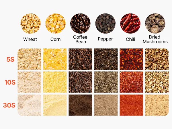 Zeitgesteuerte Mahlfunktion: Unsere Gewürzmühle bietet Zeiteinstellungen von 5, 15 und 30 Sekunden, ermöglicht 5 Minuten Dauerbetrieb mit anschließender Pause von 5–10 Minuten, die freie Einstellung des Mahlgrads und bietet Feinheitsgrade von 30 bis 300 Mesh
