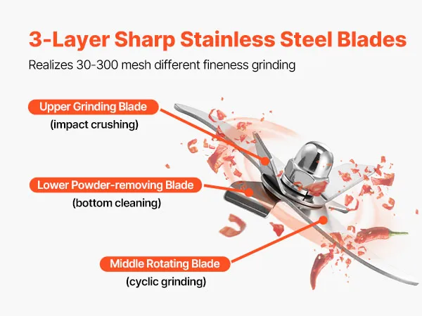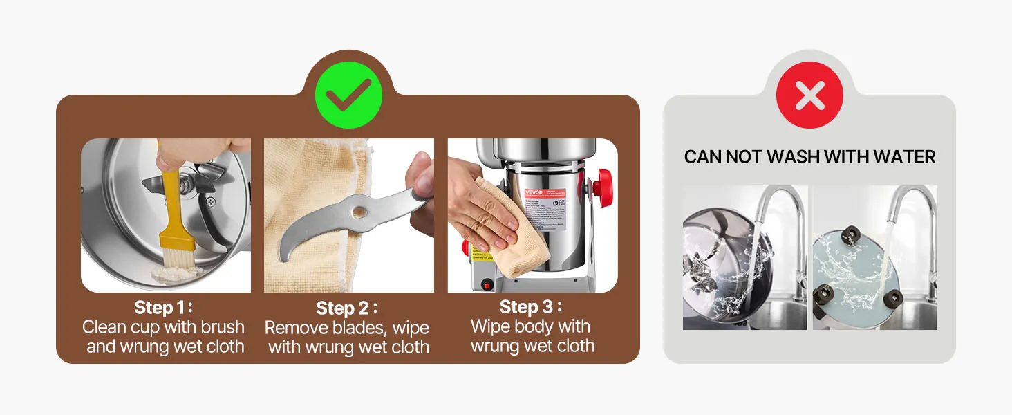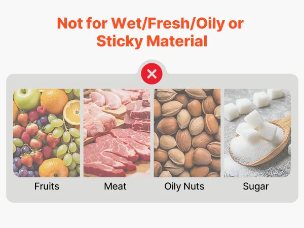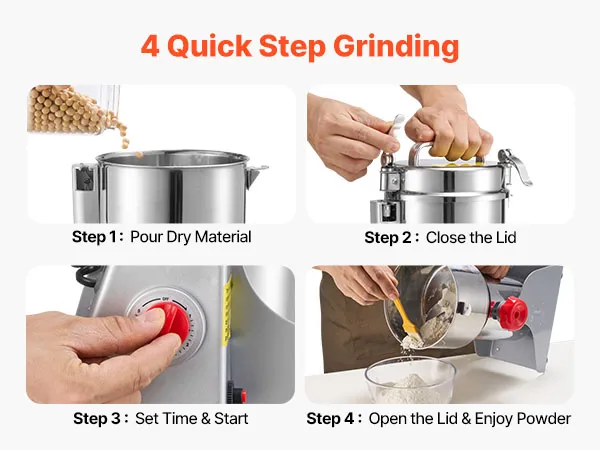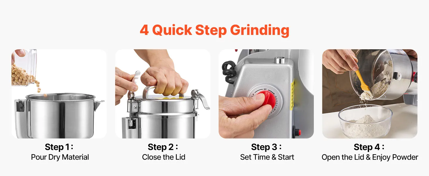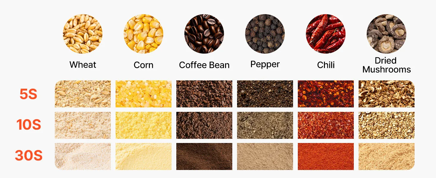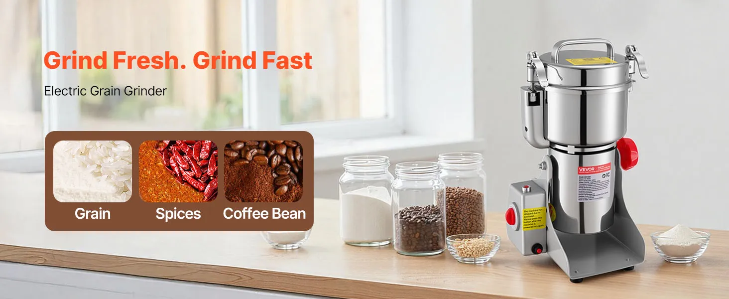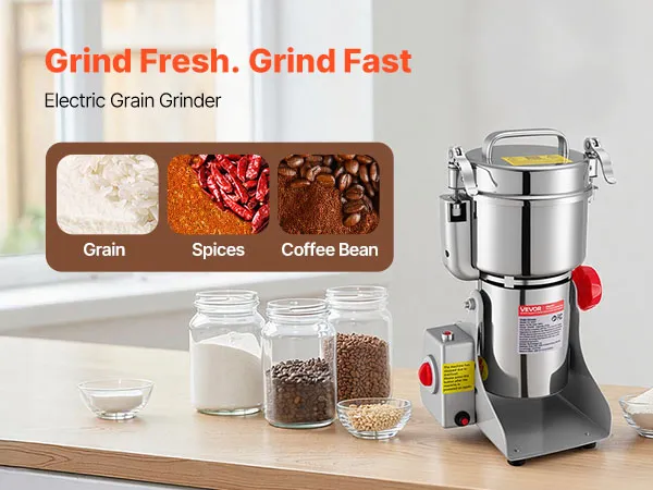 Mehrzweck-Trockengutmühle: Die elektrische Getreidemühle eignet sich zum Mahlen von Getreide (Weizen, Sojabohnen, Mais, Kaffeebohnen) und Gewürzen (Pfeffer, Zimt, Anis). Härtere Zutaten sollten vorab zerkleinert werden. Sie ist nicht für feuchte, ölige oder klebrige Materialien geeignet und findet breite Anwendung in Küchen und Laboren