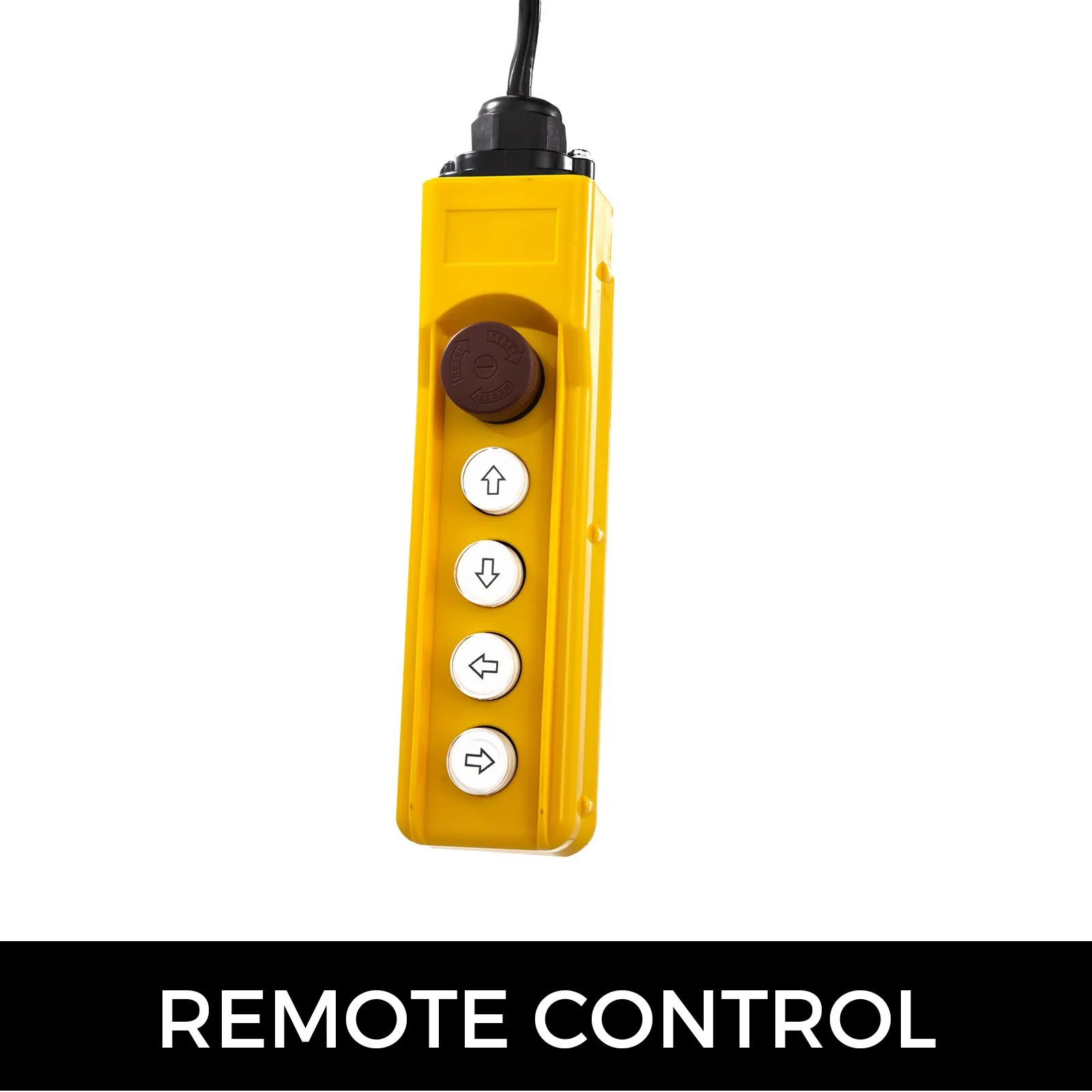 Die Kabelfernbedienung verfügt über die Tasten AUF / AB , LINKS / RECHTS sowie den Not-Aus-Schalter. Durch diesen Bedienungsschalter am Lasthaken wird Arbeitssicherheit gewähleistet.