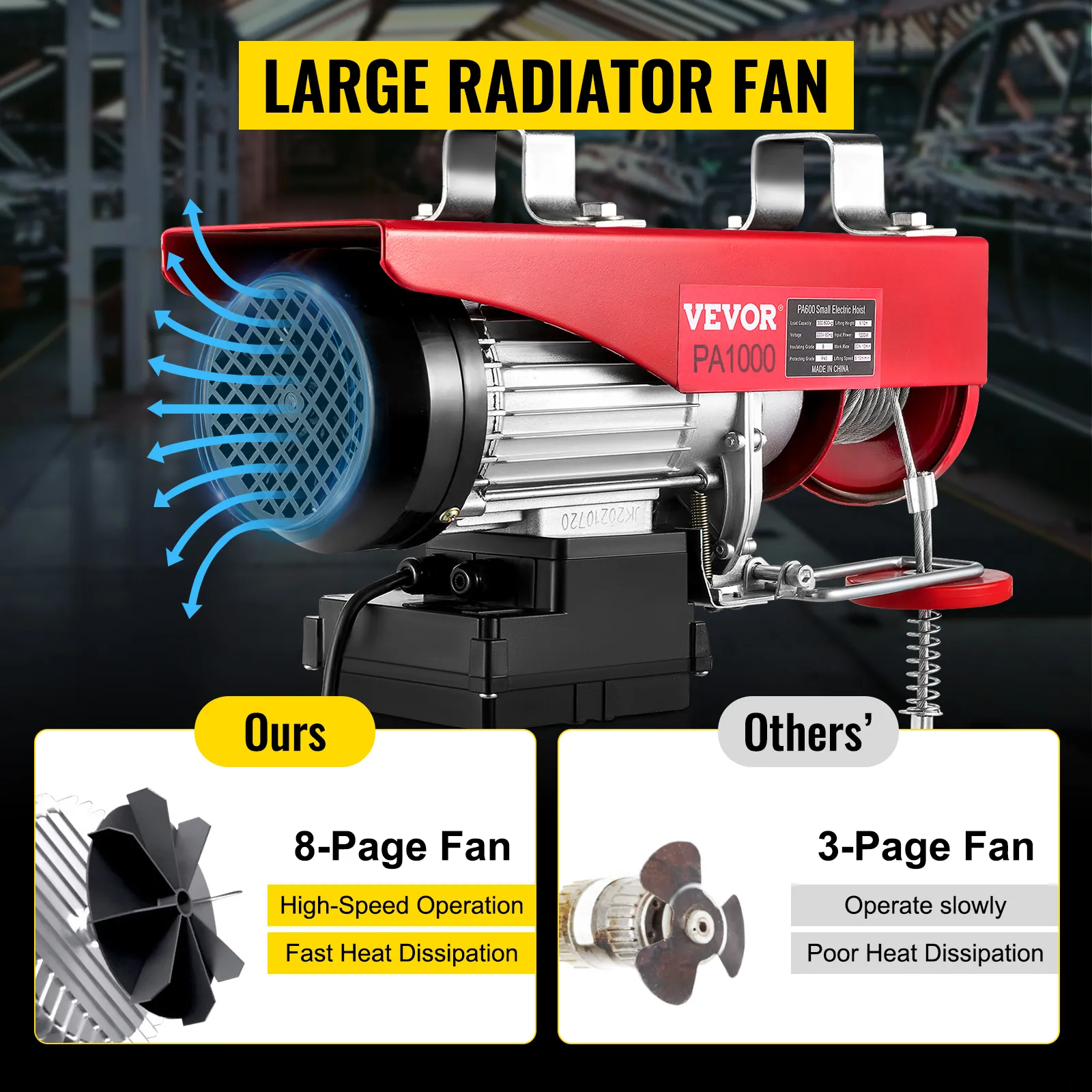 Unser Hebezeug ist mit einem großen 8-seitigen Fächer Kühlventilator ausgestattet. Dieses durchdachte Detail sorgt für schnellere Wärmeableitung der Maschine und hohe Arbeitseffizienz. Der 8-seitige Kühlventilator arbeitet geräuscharm.