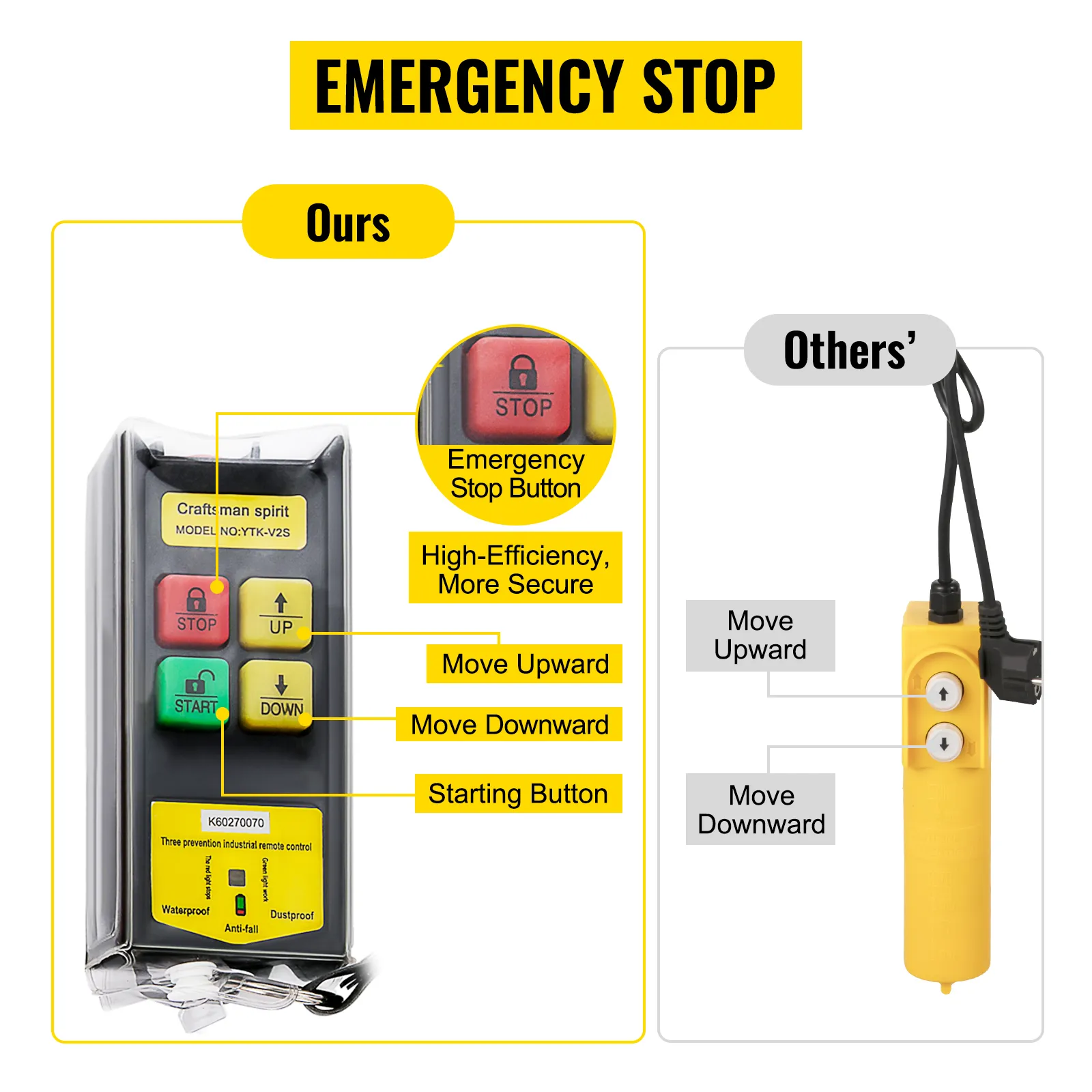 Im Gegensatz zu anderen Hebezeugen ist unser Hebezeug mit einer Not-Aus-Taste ausgestattet. Das bedeutet, dass Sie die Maschine jederzeit anhalten können, um einen Unfall zu vermeiden und sie sicher zu betreiben. Mit den Druckknöpfen können Sie nach oben und nach unten steuern.