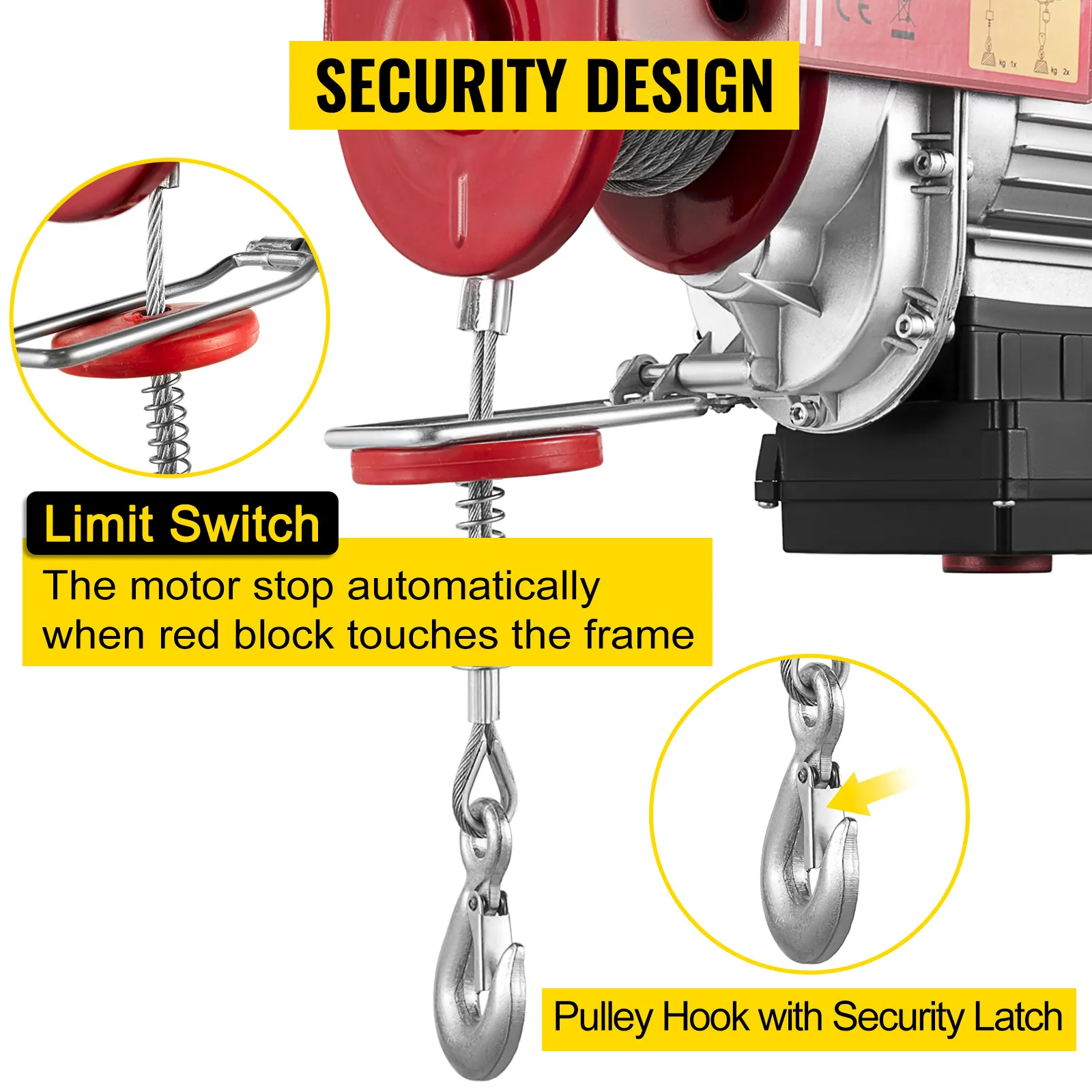 Wenn der rote Block den Endschalter berührt, stoppt der Motor automatisch, um eine Überlastung der Ketten zu verhindern. Außerdem ist das verzinkte, verdrehsichere Stahlseil weniger anfällig für Verdrehungen und somit sicherer.