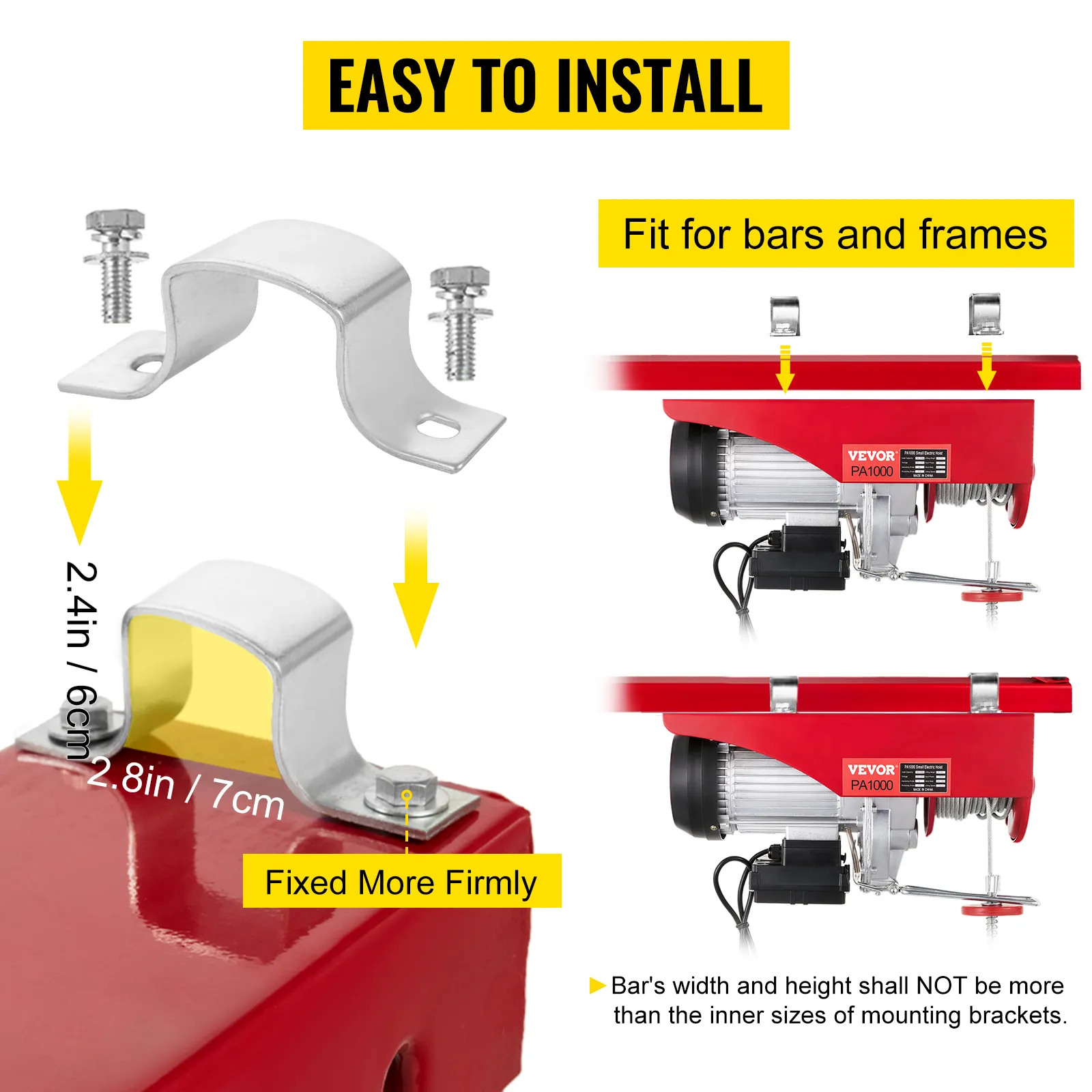 Bitte verwenden Sie eine quadratische oder rechteckige Metallstange zur Befestigung des Hebezugs. Die Breite und Höhe der Stange darf NICHT größer sein als die Innenmaße der Befestigungsklammern.
