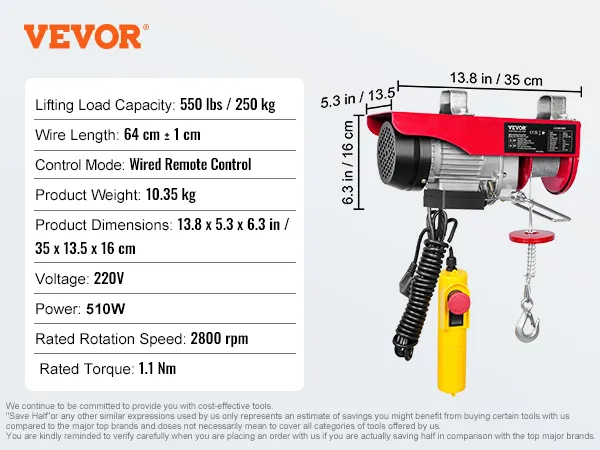 Mit dieser elektrischen Hebefunktion können Sie schwerere Lasten heben, um die Anforderungen an Hebeanwendungen und Sicherheit zu erfüllen. Ihre Arbeit wird mit dem elektrischen Hebezeug einfacher und schneller. Die elektrische Hebewinde von VEVOR mit Fernbedienung verwendet zwei Seilzüge.