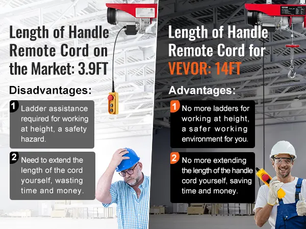 Sicheres Arbeiten ist einfacher, wenn Sie den elektrischen Hebezeug aus der Ferne steuern können. Mit der kabelgebundenen Fernbedienung des VEVOR-Hebezeugs können Sie von der Last entfernt stehen. Dank des langen Kabels müssen Sie nicht direkt neben der Last stehen. So bleiben Sie außer Gefahr, was für die Sicherheit sehr wichtig ist.