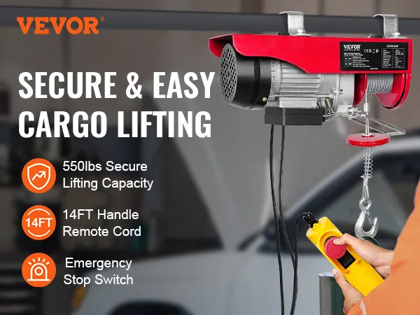 Sie können darauf vertrauen, dass Ihre Gegenstände beim Heben nicht verrutschen. Der elektrische Hebelift von VEVOR verfügt über einen starken Stahlhaken mit Sicherheitsriegel. Dieser Riegel schließt automatisch, um die Last sicher an Ort und Stelle zu halten. So wird ein versehentliches Herunterfallen des Gegenstands verhindert.