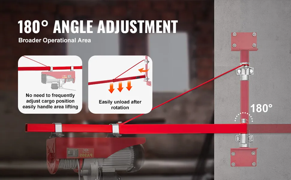 Passt sich Ihren Bedürfnissen an: Genießen Sie die Flexibilität der 180-Grad-Winkeleinstellung mit diesem elektrischen Hebearm und erweitern Sie Ihren Aktionsradius für reibungslosere, effizientere Hebeaufgaben. Keine ständige Neupositionierung mehr – erledigen Sie die Arbeit mit Leichtigkeit.