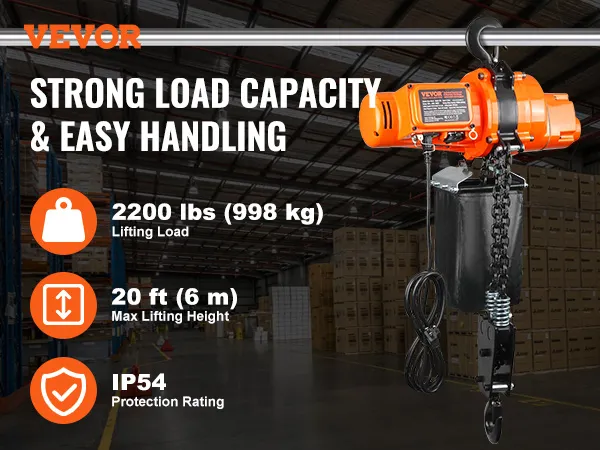 Bewältigen Sie jede schwere Last mit einer Kraft von ca.1000 kg! Unser elektrischer Kettenzug ist Ihre sichere Wahl für Garagen- und Werkstattarbeiten. Er ist IP54-zertifiziert und für jedes Wetter und jede Umgebung geeignet. Er ist Ihre erste Wahl für zuverlässige Leistung.