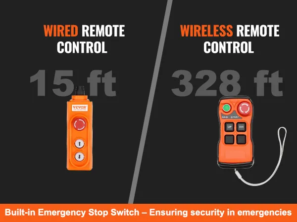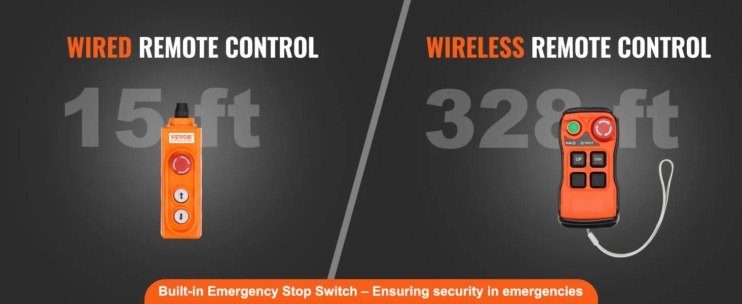 Kabellose und kabelgebundene Doppelsteuerung: Bei unserem elektrischen Kettenaufzug können Sie zwischen einem 15 Fuß / 4,5 m langen Sicherheitskabel für die kabelgebundene Steuerung und einer 328 Fuß / 100 m langen kabellosen Reichweite für ultimative Freiheit wählen. Perfekt für Werkstätten und Arbeiten im Freien, der ultimative Effizienz-Booster.