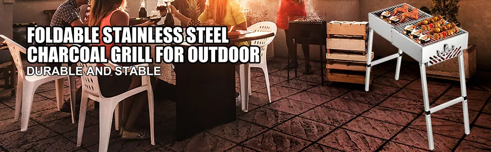 410 Edelstahl-Grill Der kleine Holzkohlegrill ist langlebig, robust und erfordert eine einfache Reinigung. Beine aus Aluminiumlegierung mit geringem Gewicht haben eine hohe Festigkeit.