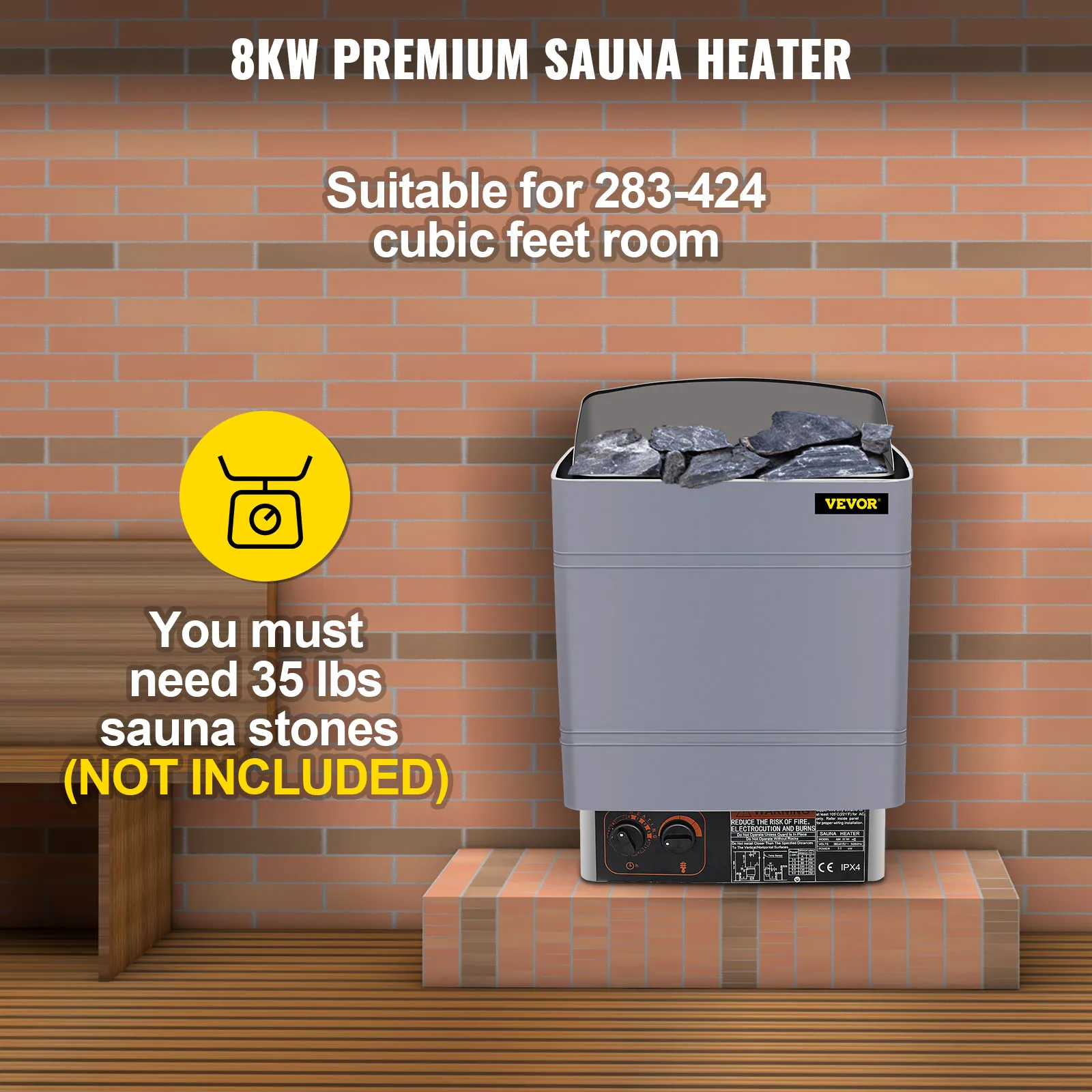 • Hochwertiger Saunaofen: Leistung: 8 kW; Betriebsspannung: 380-415 V; Stromstärke: 12,1 A; geeigneter Saunaraum: 283-424 Kubikfuß (8-12 m³), 190 cm Höhe; Saunasteine erforderlich: 16 kg; Temperaturbereich: 30-110℃. Hinweis: Saunasteine sind NICHT im Lieferumfang enthalten.