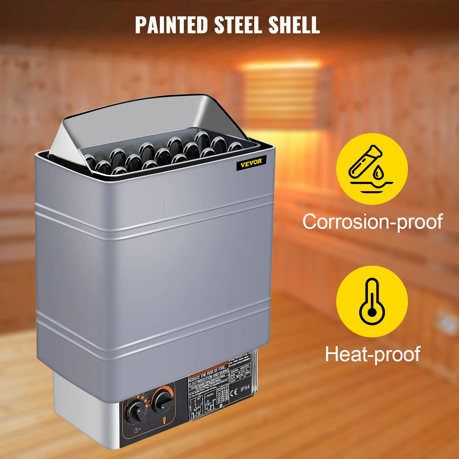 • Lackierte Stahlstruktur: Aus ausgezeichnetem lackiertem Stahl gefertigt, ist unser Saunaofen korrosionsbeständig und langlebig. Mit einer energiesparenden Heizspirale aus Edelstahl 316 erwärmt sich der Ofen schnell. Darüber hinaus ist die Oberfläche mit einer Beschichtung behandelt, um die Luft und den Kontakt mit dem Edelstahl zu isolieren und einen nicht oxidierenden Effekt zu erzielen.