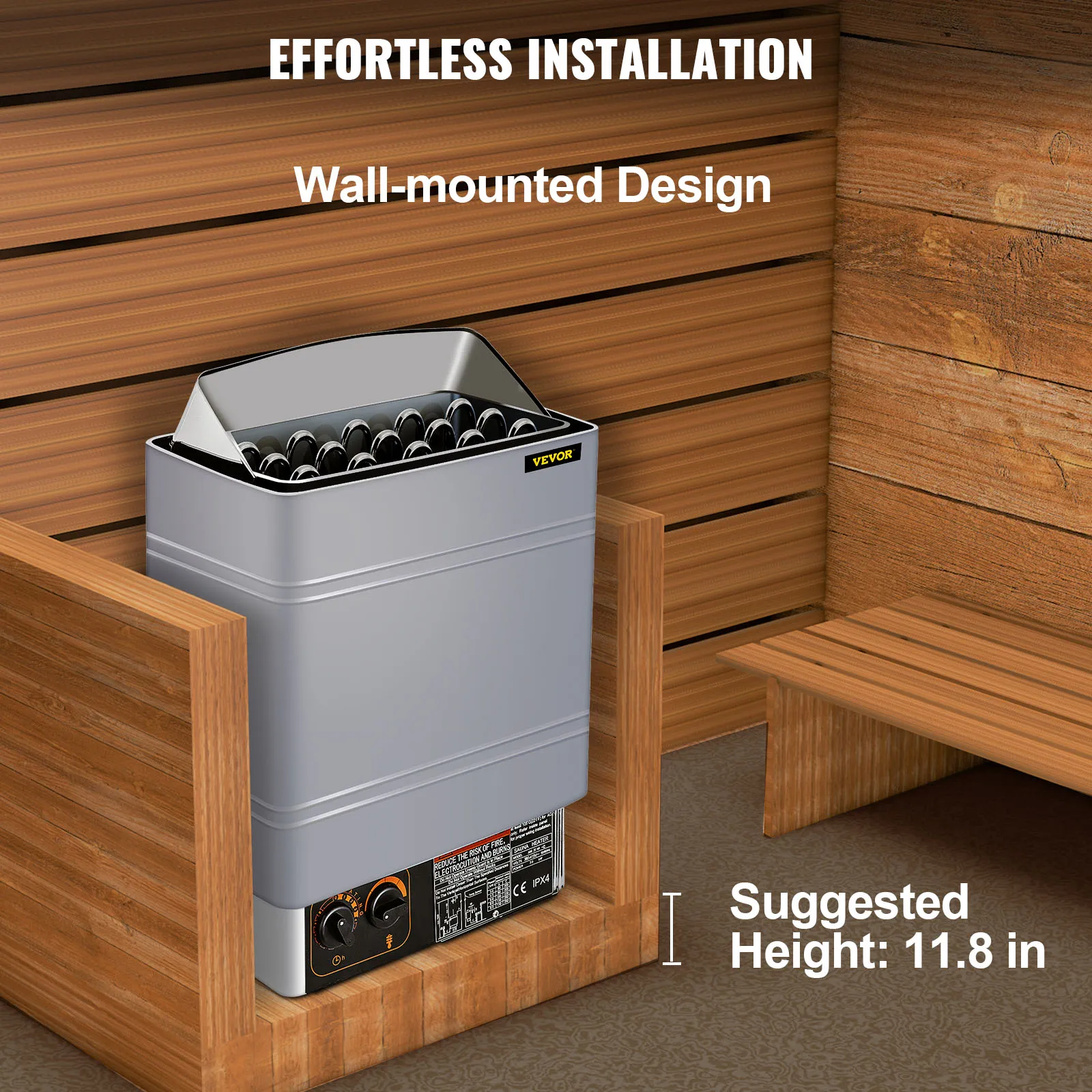 • Wandmontage Design: Mit einer vorgebohrten Halterung (mit reservierten Spannschlössern und verdeckten Spannschlösser) ist die Installation arbeitssparend. Es wird empfohlen, den Dampfsaunaofen in einer Höhe von 30 cm über dem Boden zu installieren, um eine bessere Wärmeableitung und eine sichere Nutzung zu gewährleisten.
