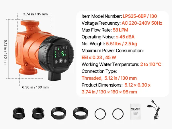 Hervorragende Leistung: Diese Zirkulationspumpe mit 220–240 V Wechselstrom und 50 Hz liefert einen maximalen Durchfluss von 58 l/min und eine maximale Förderhöhe von 6 m. Verfügt über einen maximalen Stromverbrauch von EEI ≤ 0,23, 45 W, einen weiten Flüssigkeitstemperaturbereich von 2 °C bis 110 °C und die Schutzart IP44.