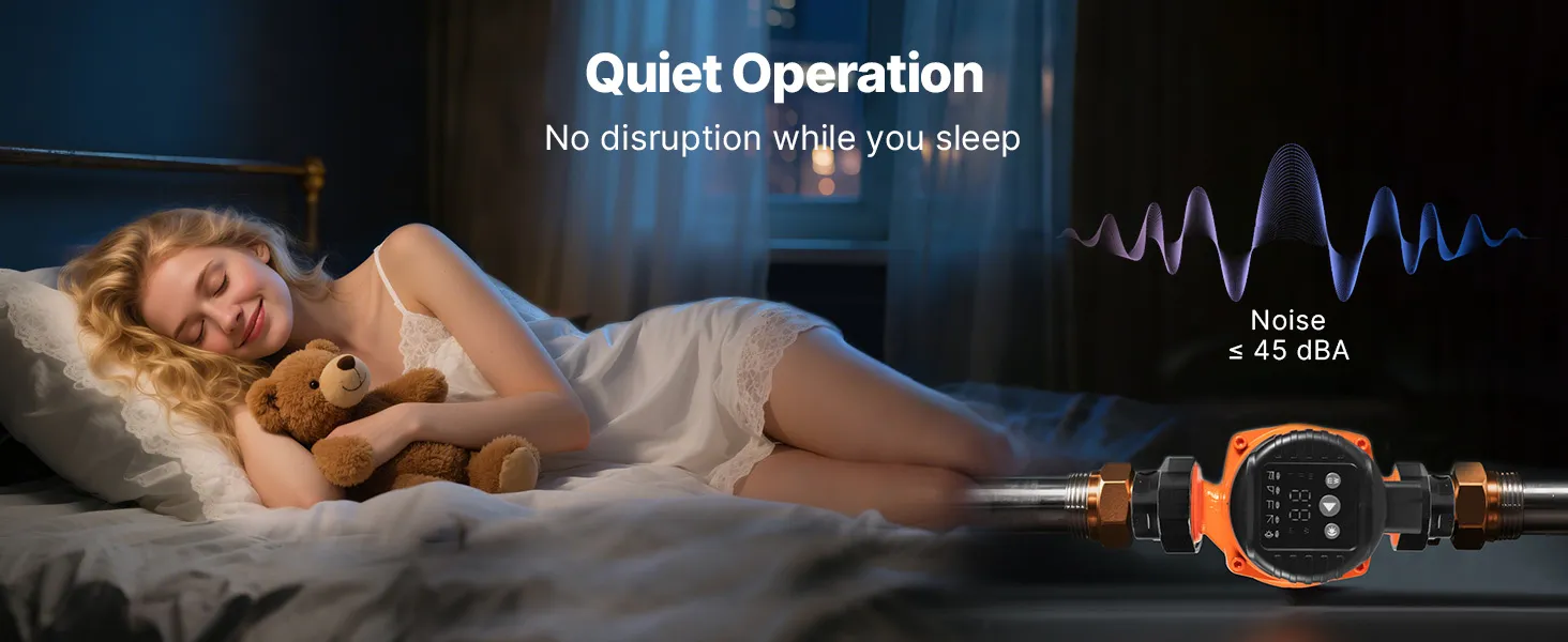 Mit einem Geräuschpegel von unter 45 dBA läuft diese Warmwasser-Umwälzpumpe reibungslos, ohne den Hausalltag oder die Ruhe zu stören. Sie ist für den Einsatz in der Nacht geeignet und sorgt für eine ruhige Umgebung für die ganze Familie.