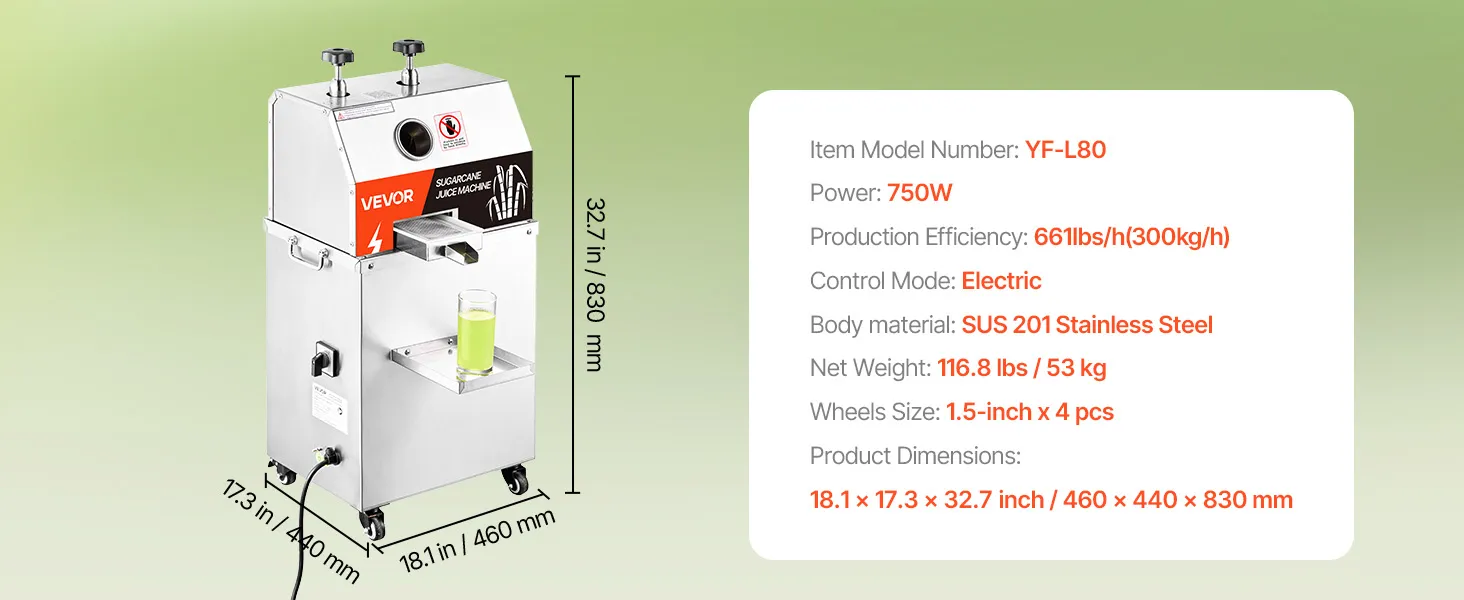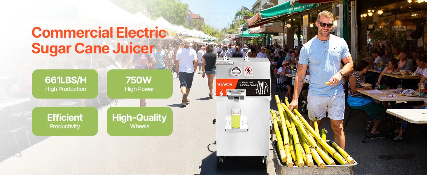 Effiziente Produktivität beim Entsaften: Der elektrische Zuckerrohr-Entsafter von VEVOR ist mit einem leistungsstarken 750 W Motor und 3 massiven Edelstahlwalzen ausgestattet, die das Entsaften von Zuckerrohr mühelos und effizient machen. Die hohe Produktivität von 661 lbs/h (300 kg/h) maximiert die Saftausbeute und Effizienz.