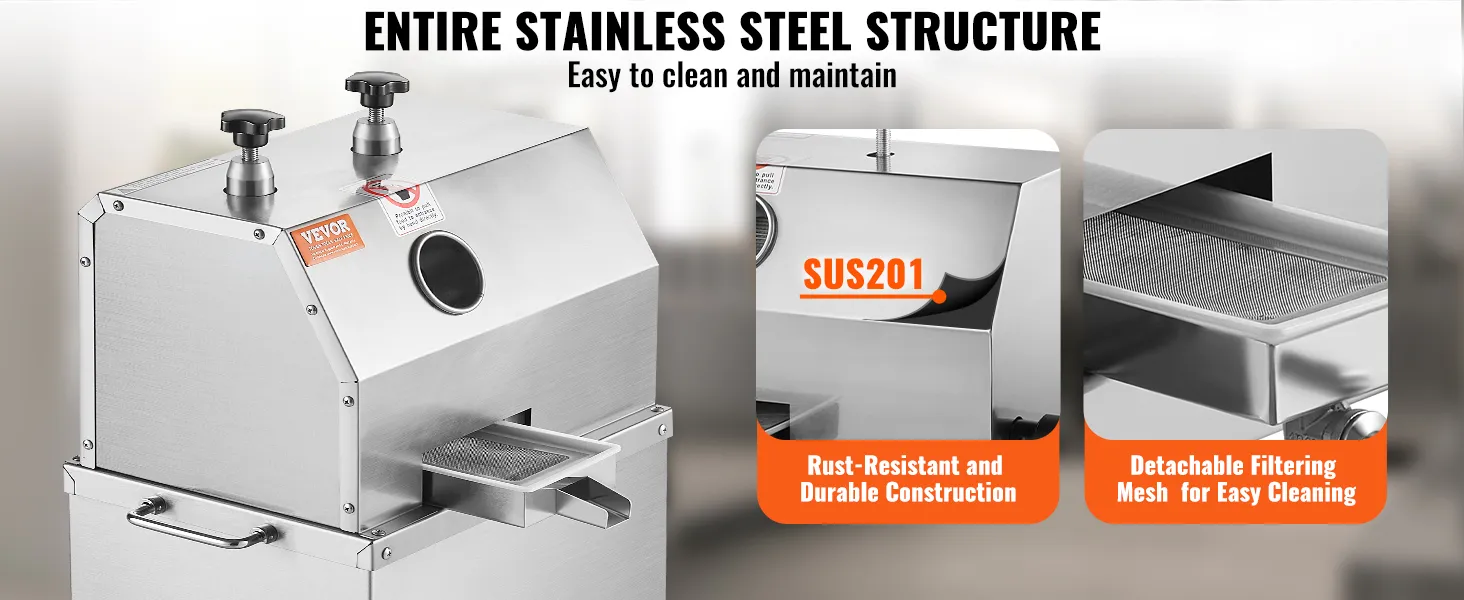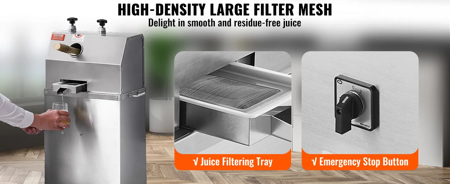 Unser Zuckerrohr-Entsafter ist vollständig aus Edelstahl gefertigt, was eine hervorragende Rostbeständigkeit und Langlebigkeit gewährleistet. Das herausnehmbare Filtersieb erleichtert die Reinigung und Wartung.