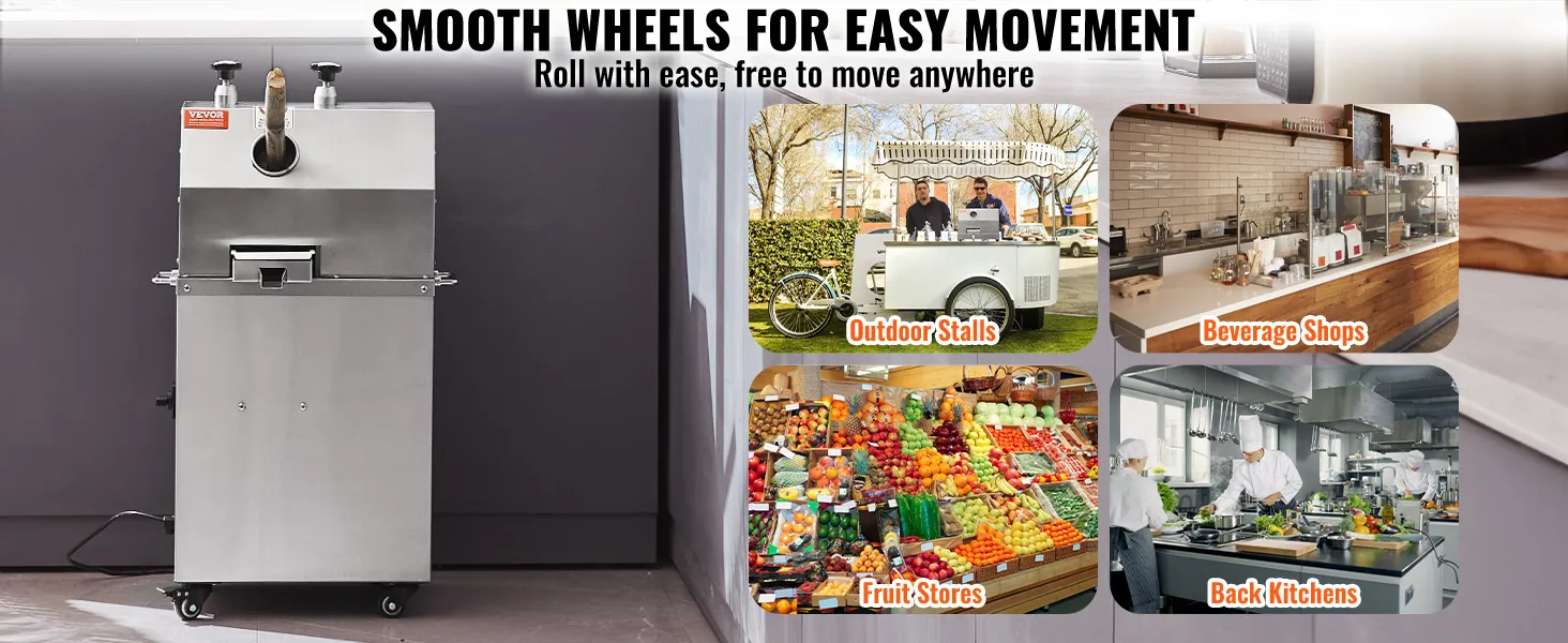 Die VEVOR Zuckerrohr-Saftpresse ist mit 4 Rädern für mühelose Mobilität ausgestattet. Sie ist vielseitig einsetzbar für Getränkemärkte, Außenstände, Obstverkäufer, Hotelküchen und vieles mehr. Genießen Sie köstlichen Zuckerrohrsaft wann und wo Sie wollen.