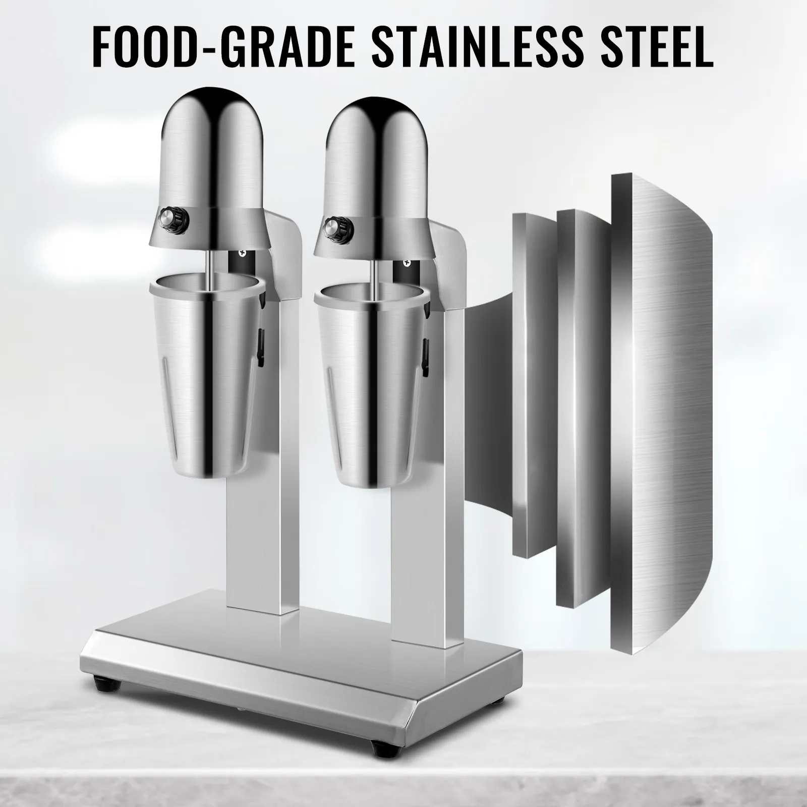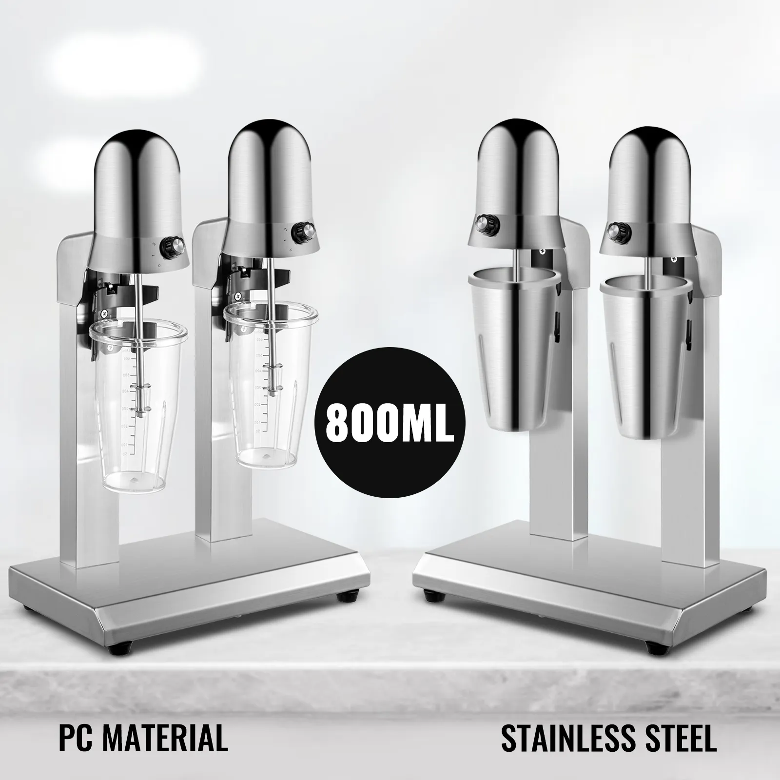 Unsere Milchshake-Maschine besteht aus strapazierfähigem Edelstahl und enthält 2 Rührwellen in Lebensmittelqualität, damit Sie Ihre Arbeit effektiv und schnell erledigen können. Dieser Getränkemischer wird mit vier großvolumigen 800-ml-Tassen geliefert, sodass Sie sofort mit dem Mixen von Getränken beginnen können. All die herausragenden Eigenschaften machen es für die Herstellung von Milchshakes, Fruchtsmoothies, Milchtee, Milchschaummischen usw. geeignet, die in Coffeeshops, Bars, Teeläden, Restaurants usw. weit verbreitet sind.