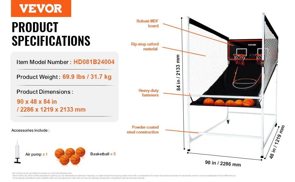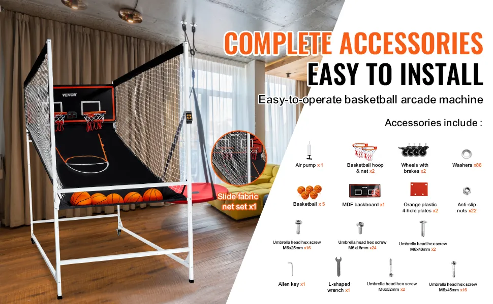 Viel Zubehör & einfacher Aufbau: Dieses Basketball-Arcade-Spiel ist komplett ausgestattet und einfach aufzubauen. Zwei Erwachsene müssen nur den Rahmen, das Netz und die Rückwand zusammenbauen. Es ist ideal für Räume mit einer Deckenhöhe von 8 Fuß (2,44 m) und ermöglicht einfache Bewegungen und Ballflug während des Spiels. Im Lieferumfang ist ein komplettes Zubehörset mit 5 Basketbällen, 2 Basketballkörben und einer Luftpumpe enthalten. Außerdem liegt eine ausführliche bebilderte Anleitung bei, die den Umgang mit dem Gerät erleichtert.