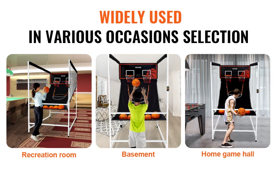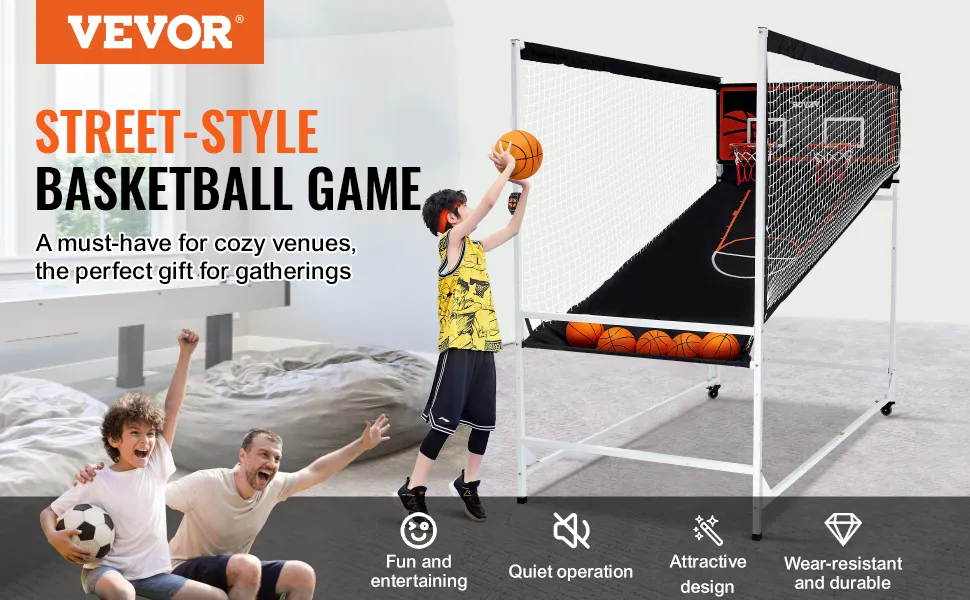Das VEVOR Arcade-Käfig-Basketballspiel ist perfekt für Familientreffen. Es hat zwei Körbe. Damit ist es ideal für zwei Spieler. Die Kinder und Erwachsenen in Ihrer Familie werden es lieben. Dieses Basketballspiel bringt Spaß und Spannung in jeden Anlass. Sie können es an Geburtstagen, Feiertagen und mehr spielen. Dank seiner robusten Bauweise hält es rauem Spiel stand. Seine verschiedenen Modi sorgen für anhaltenden Spaß. Diese Spiele sind ein Muss für Familien. Sie können mit Familie und Freunden wettkampfmäßig spielen. Das Design fördert aktives Spielen und nicht die Entwicklung von Fähigkeiten.