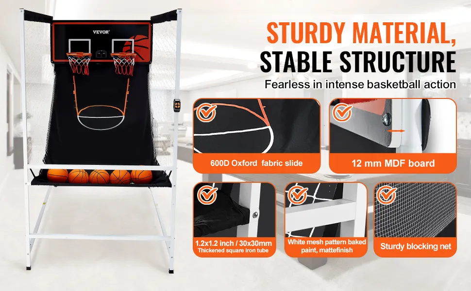 Dieses Indoor-Basketballspiel für zwei Spieler ist auf Langlebigkeit ausgelegt. Es besteht aus verdickten Vierkanteisenrohren und bietet so einen stabilen Stand. Die Maschine verfügt über zwei Arten von Fußpolstern für zusätzliche Stabilität. Die Pulverbeschichtung verhindert Rost und Absplitterungen. Die Rutsche aus 600D Oxford-Gewebe erhöht die Haltbarkeit. Diese Konstruktion stellt sicher, dass das Spiel regelmäßiger Nutzung standhält. Sie können sich darauf verlassen, dass es Ihnen langanhaltenden Spaß bereitet. Dieses Spiel ist für jahrelangen Spielspaß im Innen- und Außenbereich konzipiert.