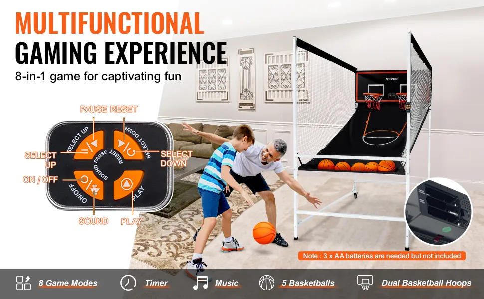 8-in-1-Multifunktionsspiel: Mehrere Spielmodi sorgen für noch mehr Spaß bei der Familienunterhaltung. Mit zwei Basketball-Punktetafeln und einem Spieltimer, geeignet für Kinder und Erwachsene. Spannende Soundeffekte sorgen für ein echtes Arcade-Erlebnis und tolle Basketball-Momente. Hinweis: Der elektronische 8-in-1 Spielstand benötigt 3 AA-Batterien, die nicht im Lieferumfang enthalten sind.