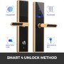 4 in 1 Türschloss. 4 Möglichkeiten zum Öffnen der Tür: Fingerabdrücke (160 Stück), Passwort (20 Gruppen), Induktionskarte (300 Stück) und mechanische Notschlüssel (2 Stück). Eine Verriegelung an der Rückseite bietet zusätzliche Sicherheitsgarantie für Raum.