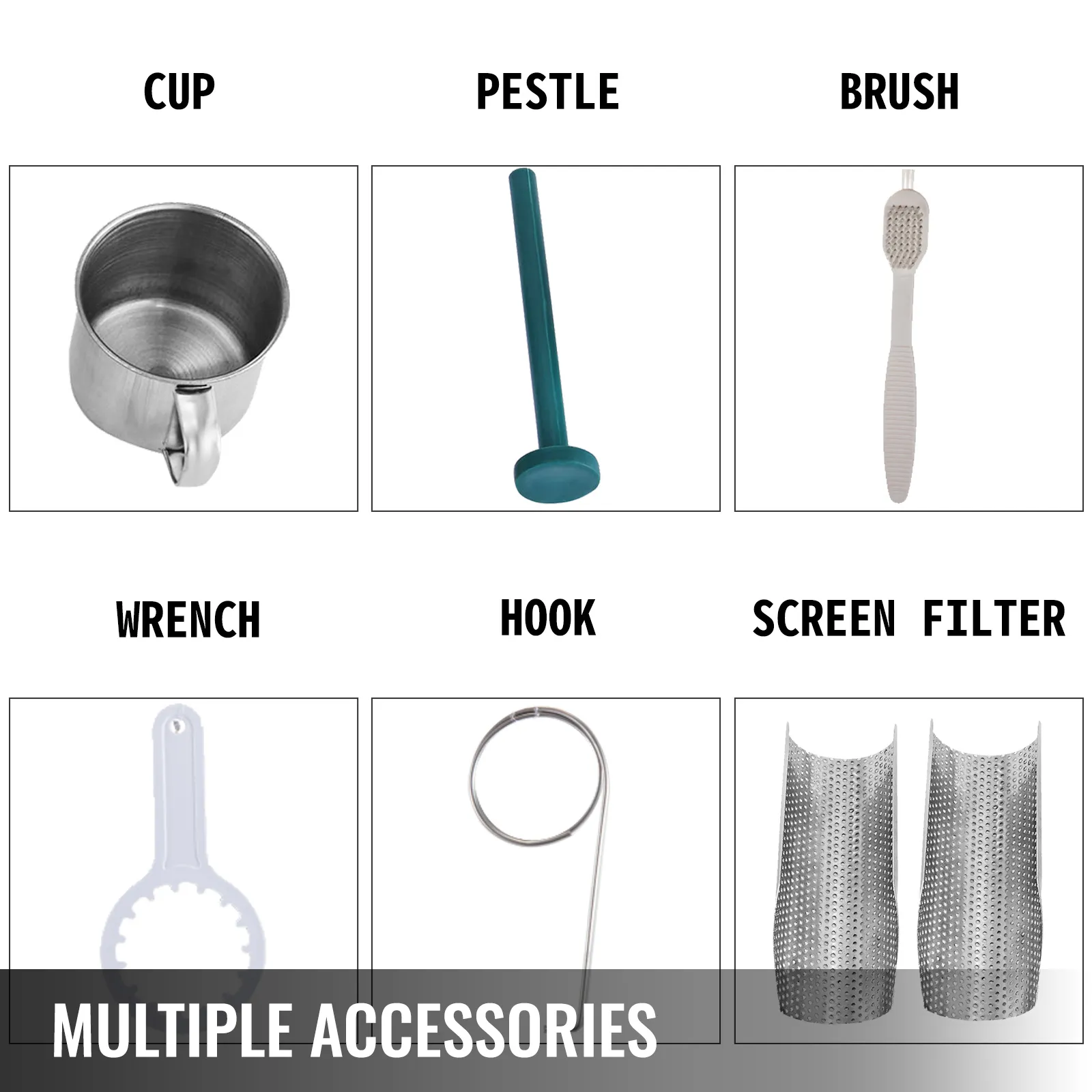 Es wird mit einer Tasse zum Sammeln des Safts, einem Stößel zum bequemen Zuführen von Zutaten, einer Bürste zum einfachen Reinigen, einem Schraubenschlüssel zum Öffnen der vorderen Abdeckung und einem Haken zum Herausziehen des Filters geliefert.