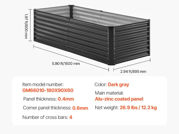 VEVOR Hochbeet aus Metall, 1800x895x600mm, verzinkter Pflanzkasten für den Außenbereich, mit offenem Boden, großes Gemüsebeet für den Anbau von Gemüse, Blumen, Kräutern und Sukkulenten, dunkelgrau