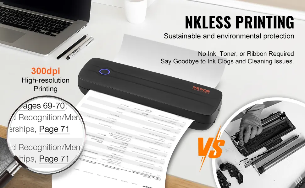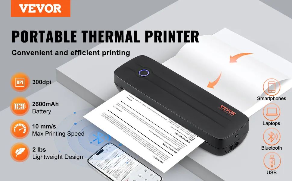 Thermotechnologie: Der tragbare Drucker von VEVOR verfügt über eine fortschrittliche Thermodrucktechnologie, eine nachhaltige Alternative zu herkömmlichen Tinten, Tonern oder Farbbändern. Genießen Sie ein sauberes, kostengünstiges Druckerlebnis, das sowohl effizient als auch umweltfreundlich ist und jedes Mal hervorragende Ergebnisse liefert.