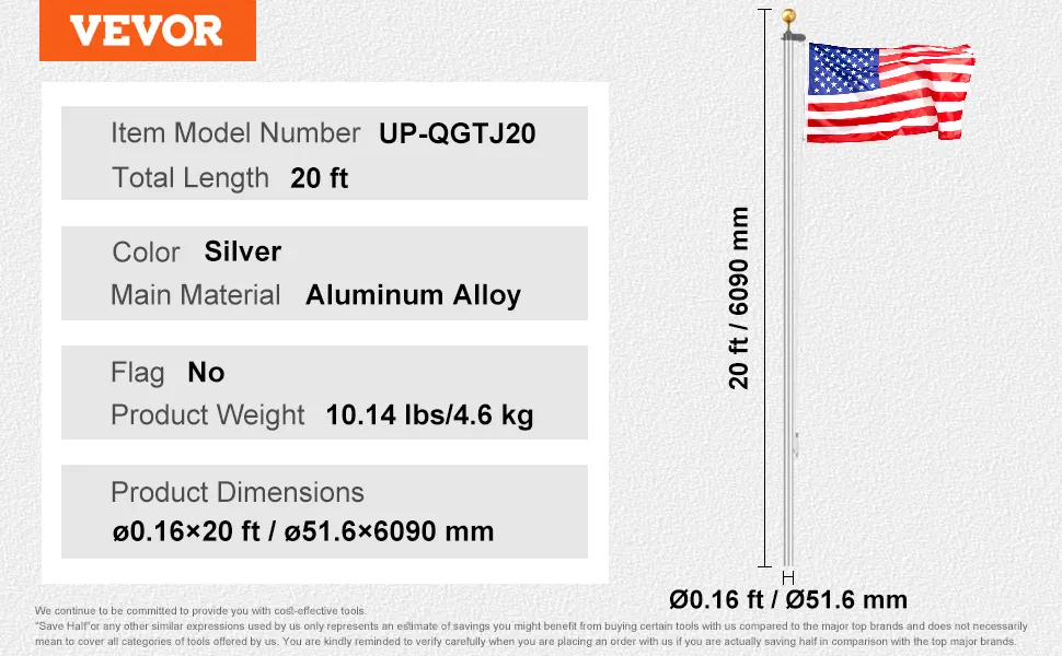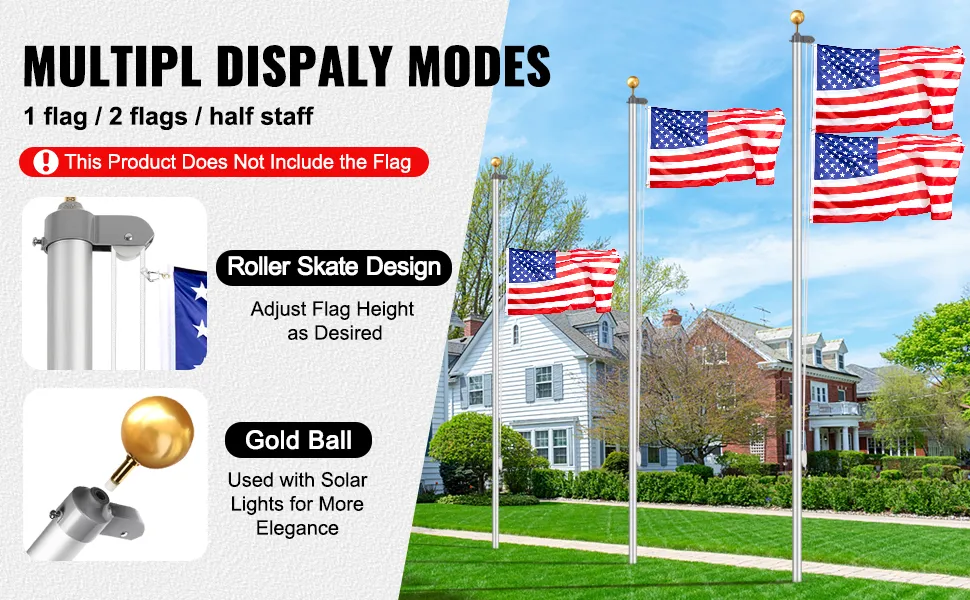 VEVOR 20ft Abnehmbarer Fahnenmast-Satz, Robuster Fahnenmast-Satz aus Aluminiumlegierung im Boden für den Außenbereich, Fahnenmast mit 3 Anzeigemodi und professionellem Zubehör, Silber