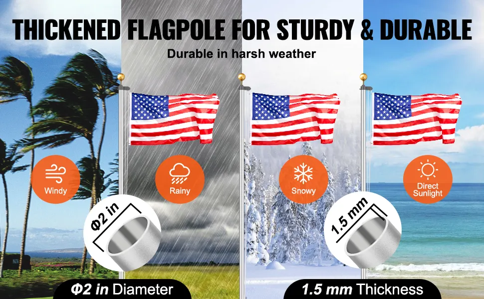 φ 2 Zoll (5,08 cm) verdickter Fahnenmast: Unser verdickter Fahnenmast hat den Test der Zeit und der Natur bestanden. Ob bei sengender Sonne, starkem Wind und Sturm oder Eis und Schnee, dieser Fahnenmast bleibt stabil und zuverlässig, sodass Sie ihn beruhigt verwenden können, ohne sich um Verformungen oder Beschädigungen sorgen zu müssen.