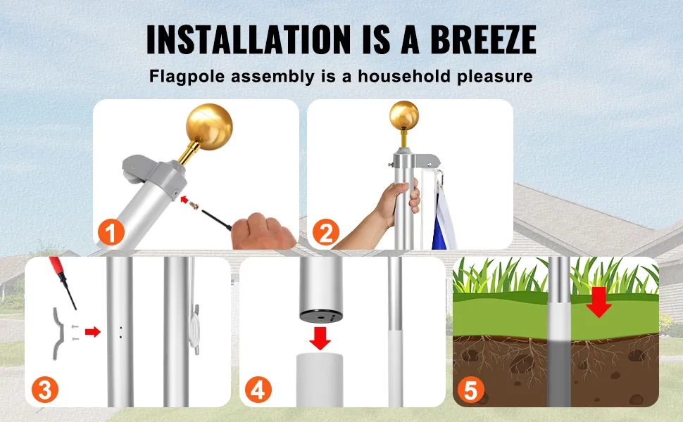 Einfache Installation: Wir bieten umfassende Installationsanweisungen und verschiedenes Zubehör wie PVC-Rohre, Kugeln und Aluminiumklammern, sodass Sie den Fahnenmast ganz einfach zusammenbauen können. Ideal für Benutzer, die Montageaufgaben lieber selbst erledigen, wie z. B. Hausbesitzer oder Veteranen, da die Installation unkompliziert und überschaubar ist.
