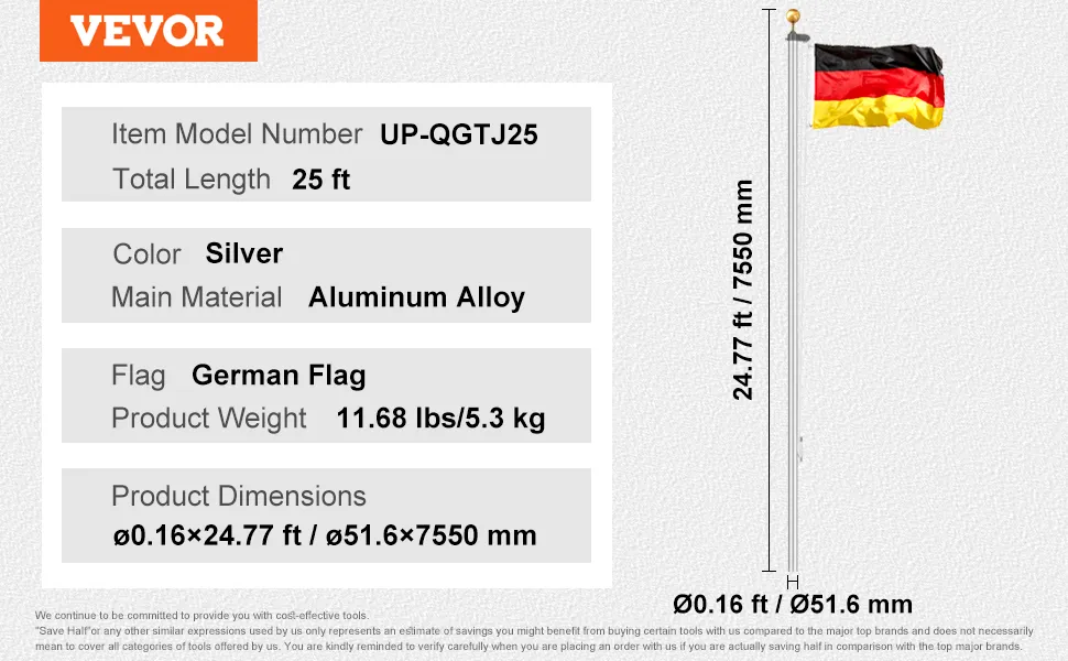 VEVOR Abnehmbarer Fahnenmast-Bausatz, 7,6 m, robustes Fahnenmast-Bausatz aus Aluminiumlegierung im Boden für den Außenbereich, Fahnenmast mit 3 Anzeigemodi und professionellem Zubehör, deutsche Flagge, Silber