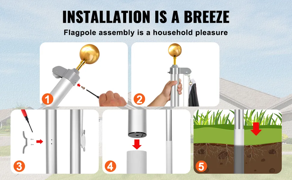 Einfache Installation: Wir bieten umfassende Installationsanweisungen und verschiedenes Zubehör wie PVC-Rohre, Kugeln und Aluminiumklammern, sodass Sie den Fahnenmast ganz einfach zusammenbauen können. Ideal für Benutzer, die Montageaufgaben lieber selbst erledigen, wie z. B. Hausbesitzer oder Veteranen, da die Installation unkompliziert und überschaubar ist.